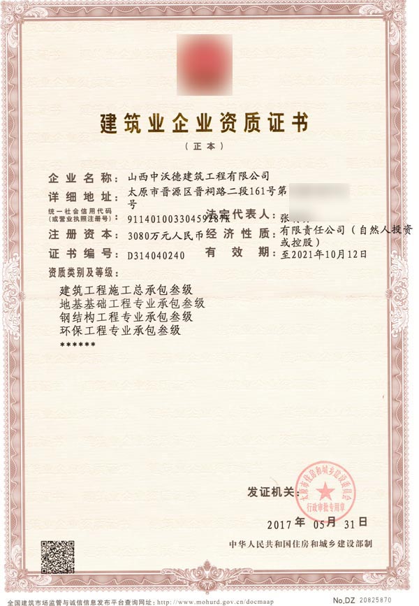 山西某建筑公司建筑業(yè)企業(yè)資質(zhì)證書(shū)